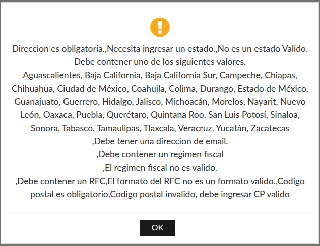 Si hay errores (por ejemplo, falta de información o parámetros mínimos no cumplidos), aparecerá una alerta con el detalle del problema. En caso de error de estado no valido debe usarse uno de los valores exhibidos en el alerta, tal como aparece ahí. Ej: